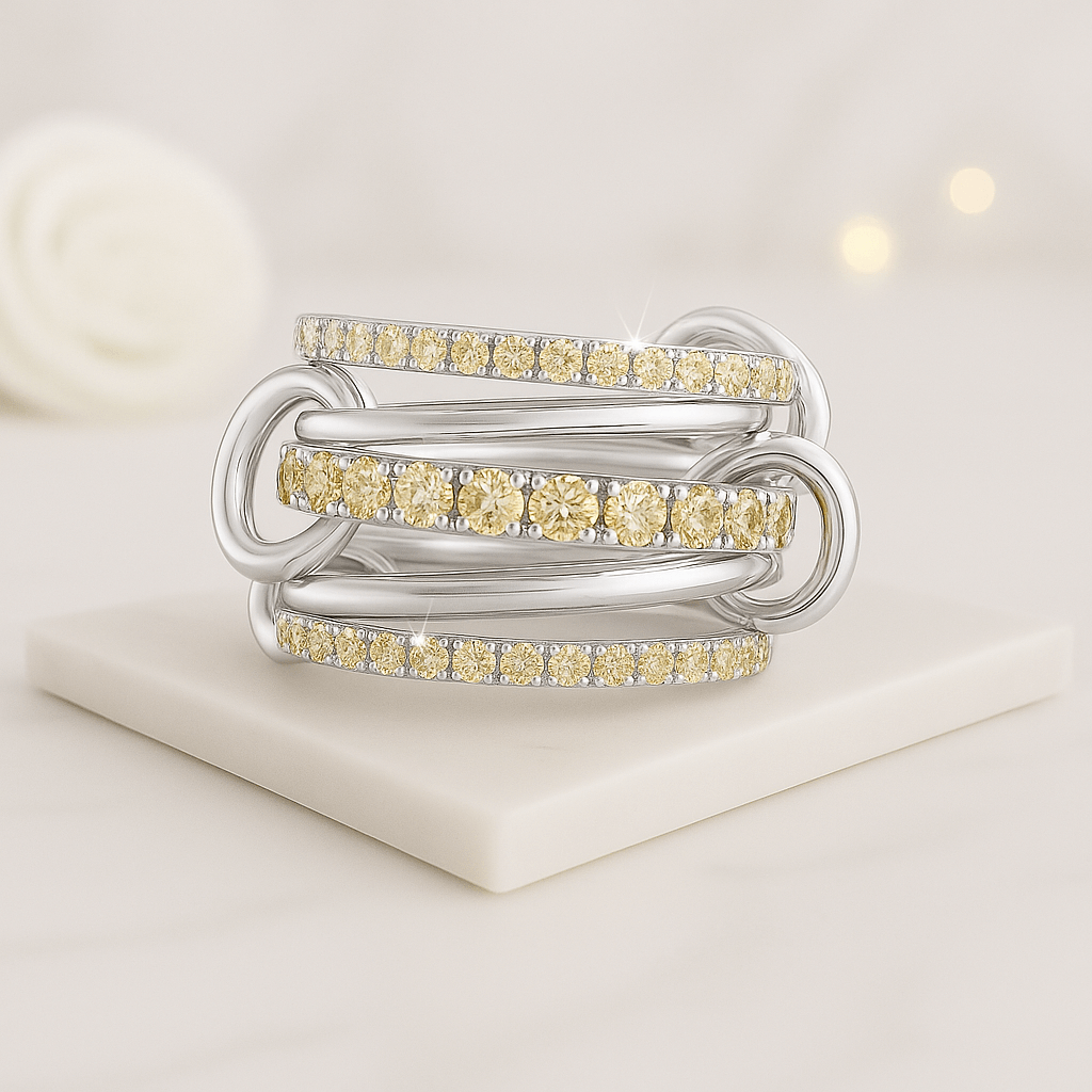 This 14K solid gold linked ring features a striking multi band design in yellow and white gold, creating a modern trio of interlocking bands. Perfect as a statement eternity ring or custom fine jewelry piece, it blends elegance with contemporary style for everyday wear or special occasions.